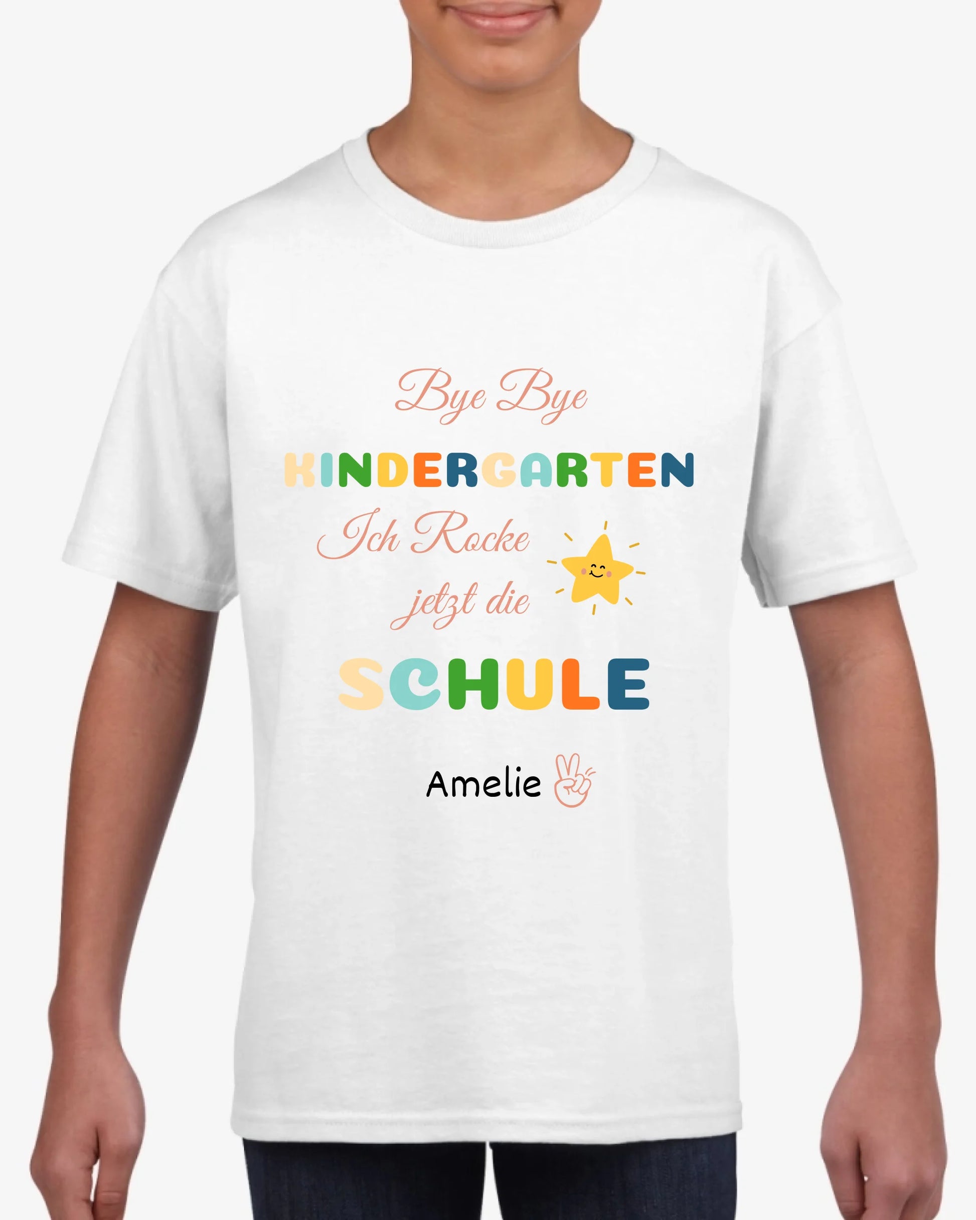 Bye bye Kindergarten, ich rocke jetzt die Schule - Personalisiertes T-Shirt für Kinder zur Einschulung (100% Baumwolle)